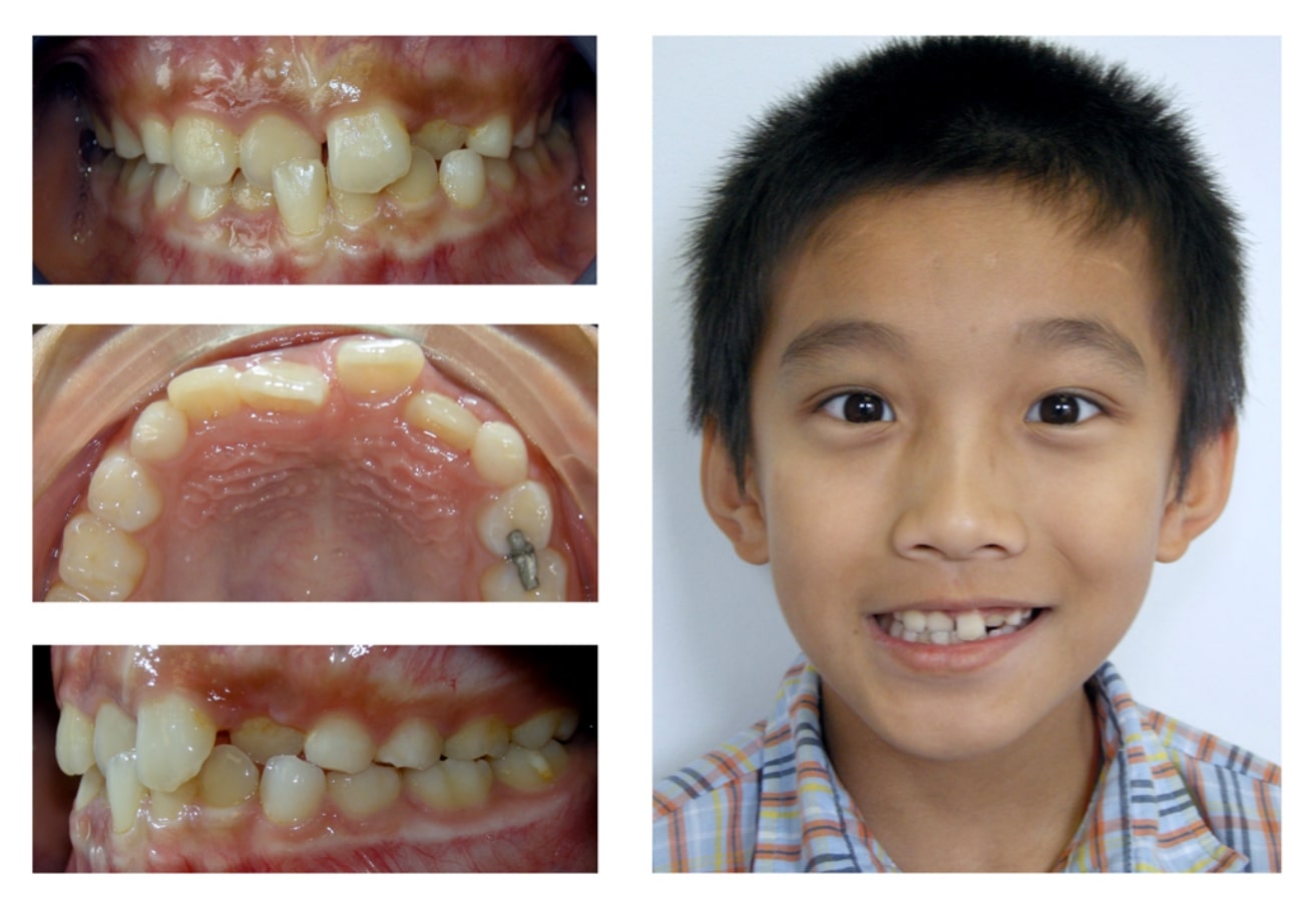 Ce patient s’est présenté en dentition mixte avec des dents antérieures supérieures en malocclusion croisée. C’est une situation qui doit être résolue le plus rapidement possible, donc nous avons commencé un traitement avec des aligneurs Invisalign pour avancer les dents antérieures supérieures et élargir les arcades dentaires supérieures et inférieures. Une deuxième phase de traitement a été réalisée une fois que toutes les dents permanentes étaient en place pour corriger tout chevauchement résiduel.